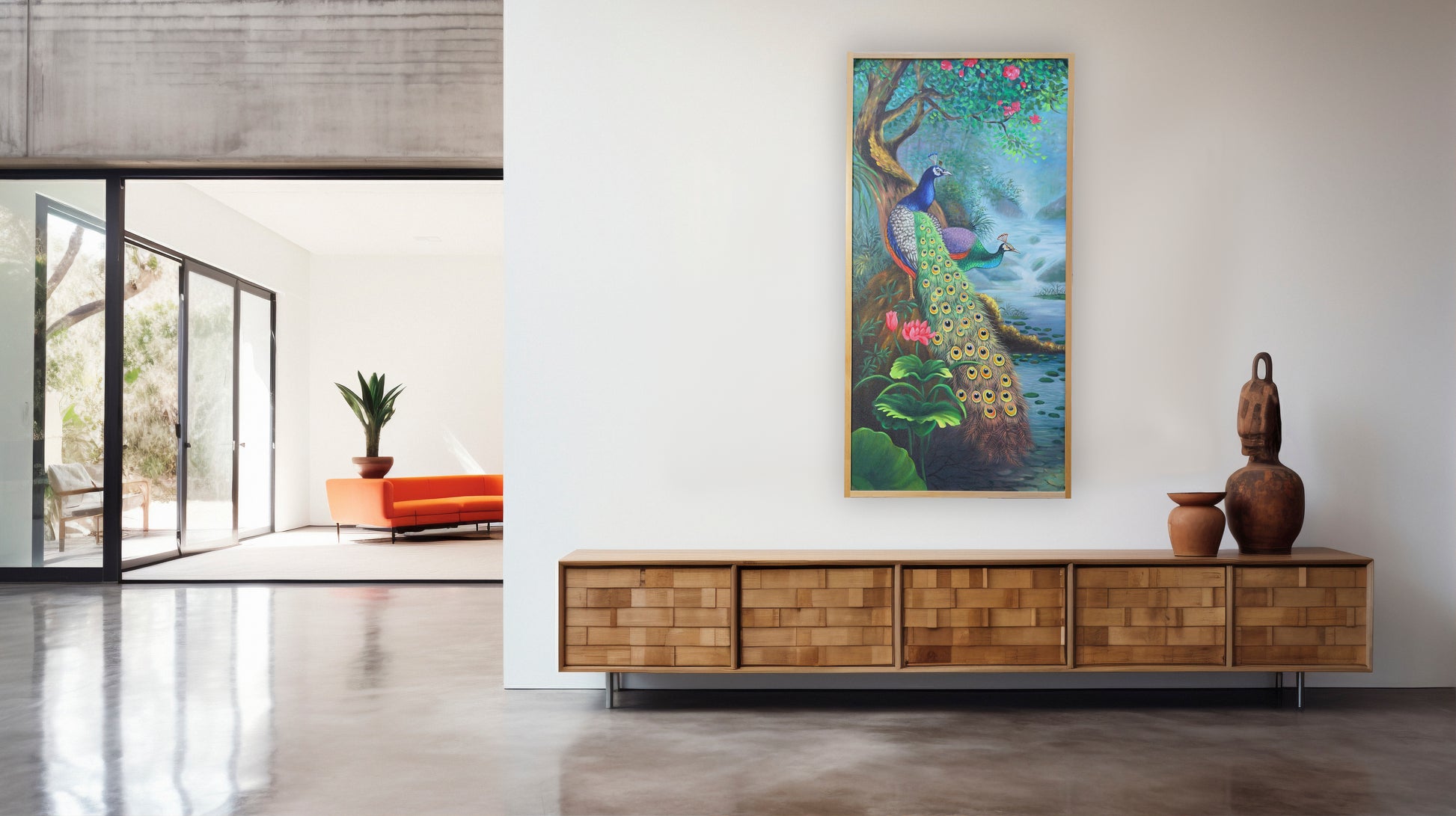 Transform your space with this serene and enchanting artwork showcasing a lush lychee tree gracefully arching over a peaceful koi fish pond. The vibrant red lychees and rich green foliage bring life and freshness to the scene, while the gently rippling water and colorful koi fish add movement, balance, and calming energy.